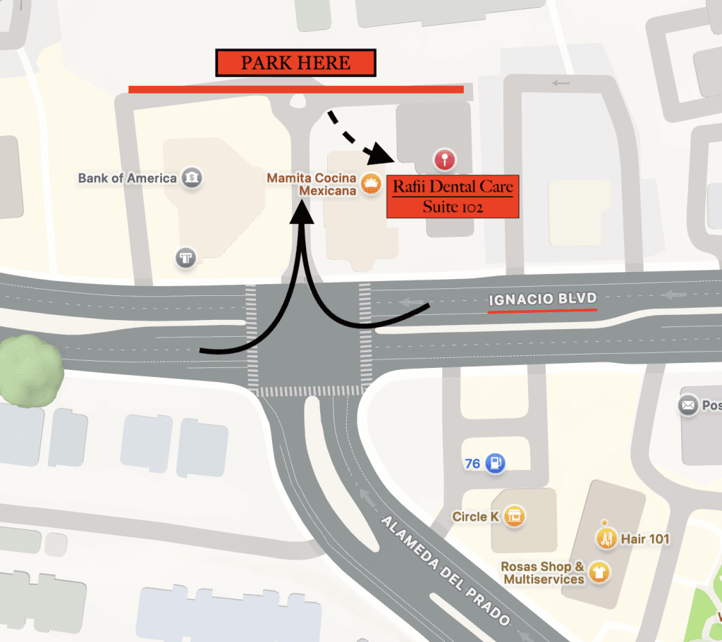 At the junction of Ignacio Blvd and Alameda Del Prado, turn into the parking lot between Mamita’s Restaurant and Bank of America (NOT West America Bank). You may park anywhere in the parking lot. Even though it says “Restaurant Parking Only”, you may still park there. You will not get a ticket/towed. The Rafii Dental Care office is next door to Mamita’s in 330 Ignacio Blvd, Suite 102.